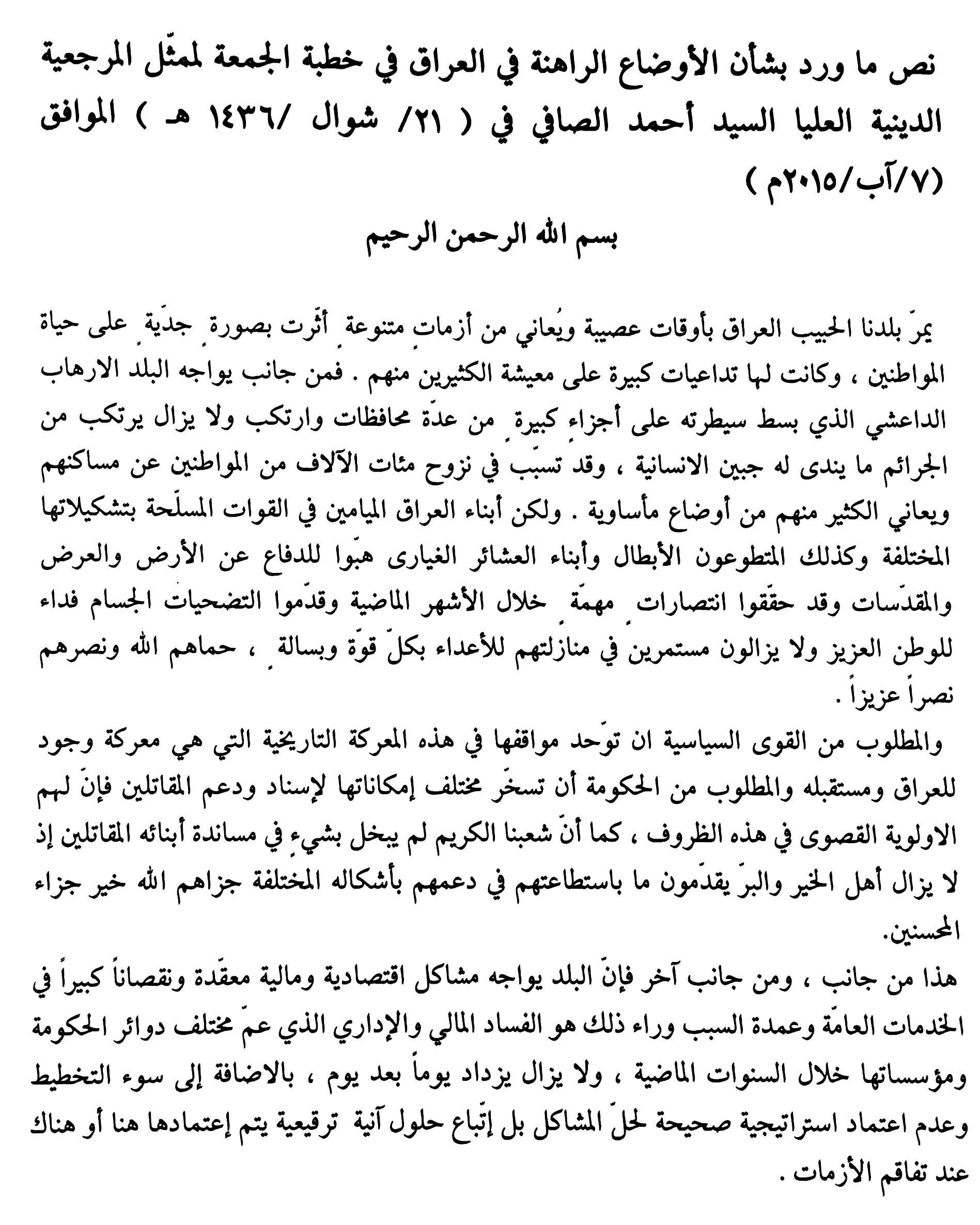 نص ما ورد بشأن الأوضاع الراهنة في العراق في خطبة الجمعة لممثّل المرجعية الدينية العليا السيد أحمد الصافي في ( 21/ شوال /1436 هـ ) الموافق (7/آب/2015
