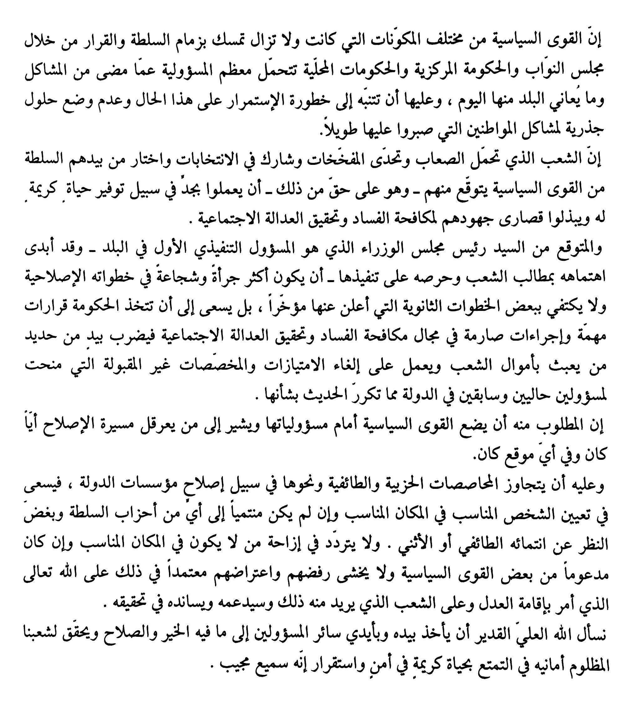 نص ما ورد بشأن الأوضاع الراهنة في العراق في خطبة الجمعة لممثّل المرجعية الدينية العليا السيد أحمد الصافي في ( 21/ شوال /1436 هـ ) الموافق (7/آب/2015م )
