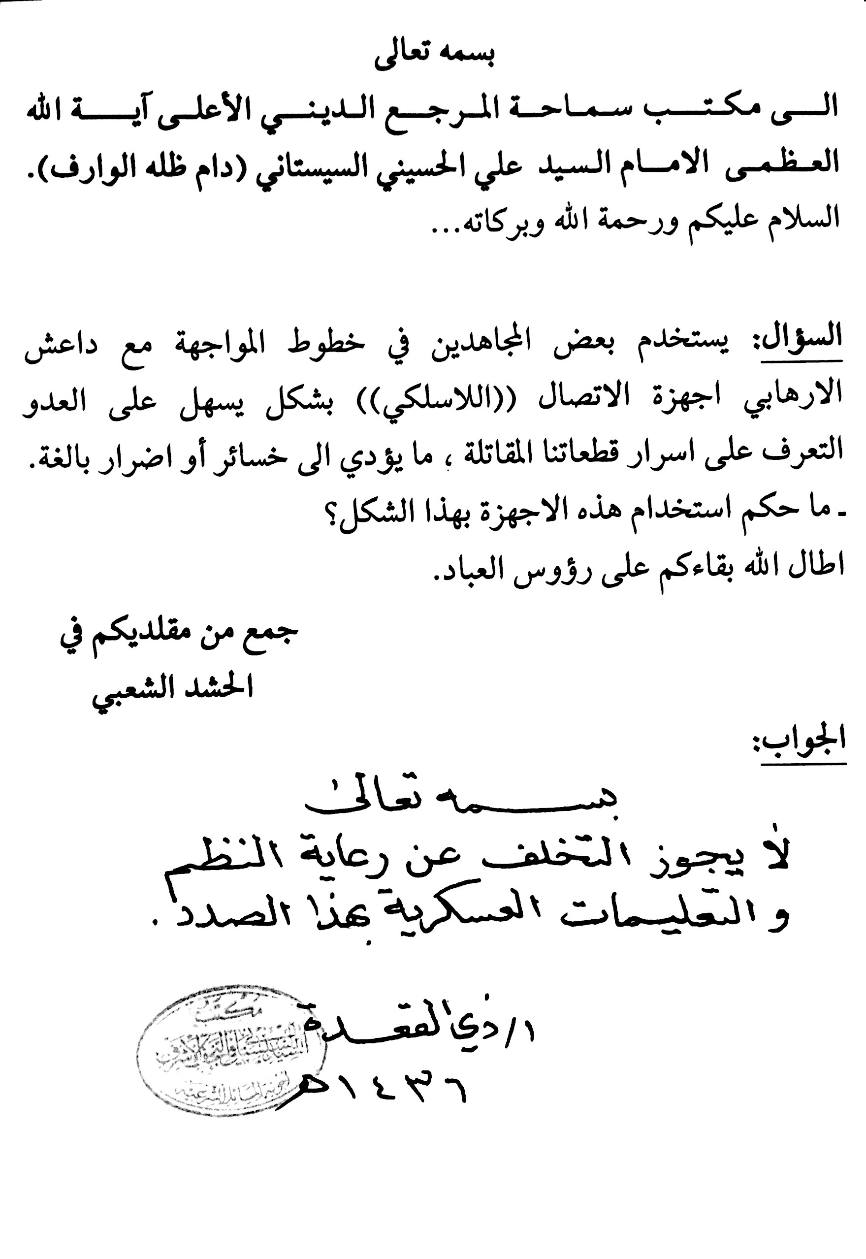استفتاء حول عدم جواز مخالفة التعليمات العسكرية في استخدام اجهزة الاتصال اللاسلكي