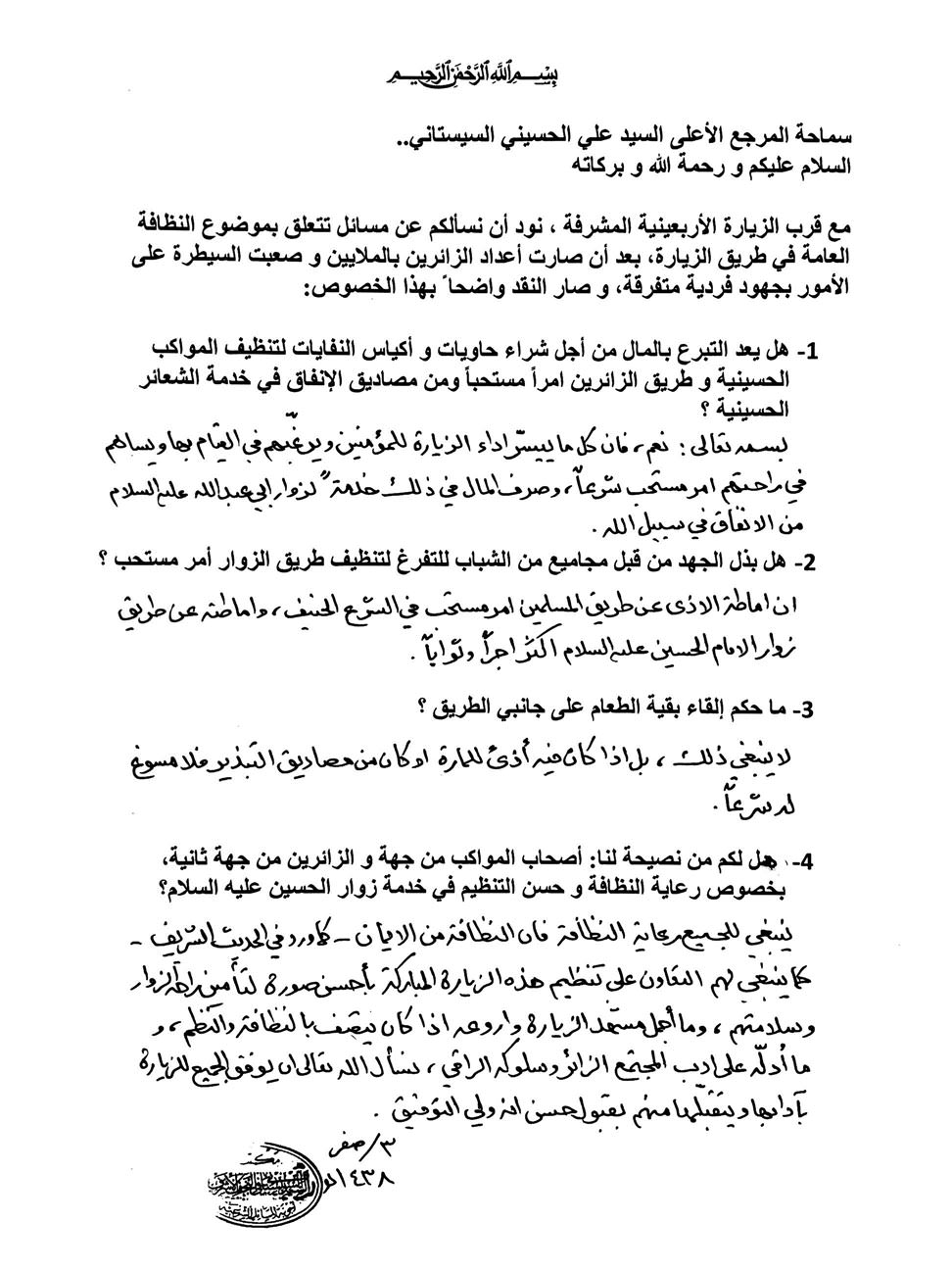 استفتاء حول رعاية النظافة والتنظيم في الزيارة الأربعينية