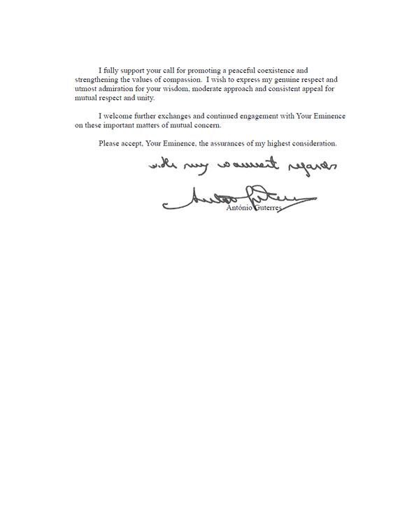 إنني أؤيد تأييداً تاماً دعوتكم إلى تعزيز التعايش السلمي وتوطيد قيم الرحمة. وأود أن أعرب عن احترامي الحقيقي وإعجابي الشديد بحكمتكم ونهجكم المعتدل وندائكم المستمر من أجل الاحترام المتبادل والوحدة.