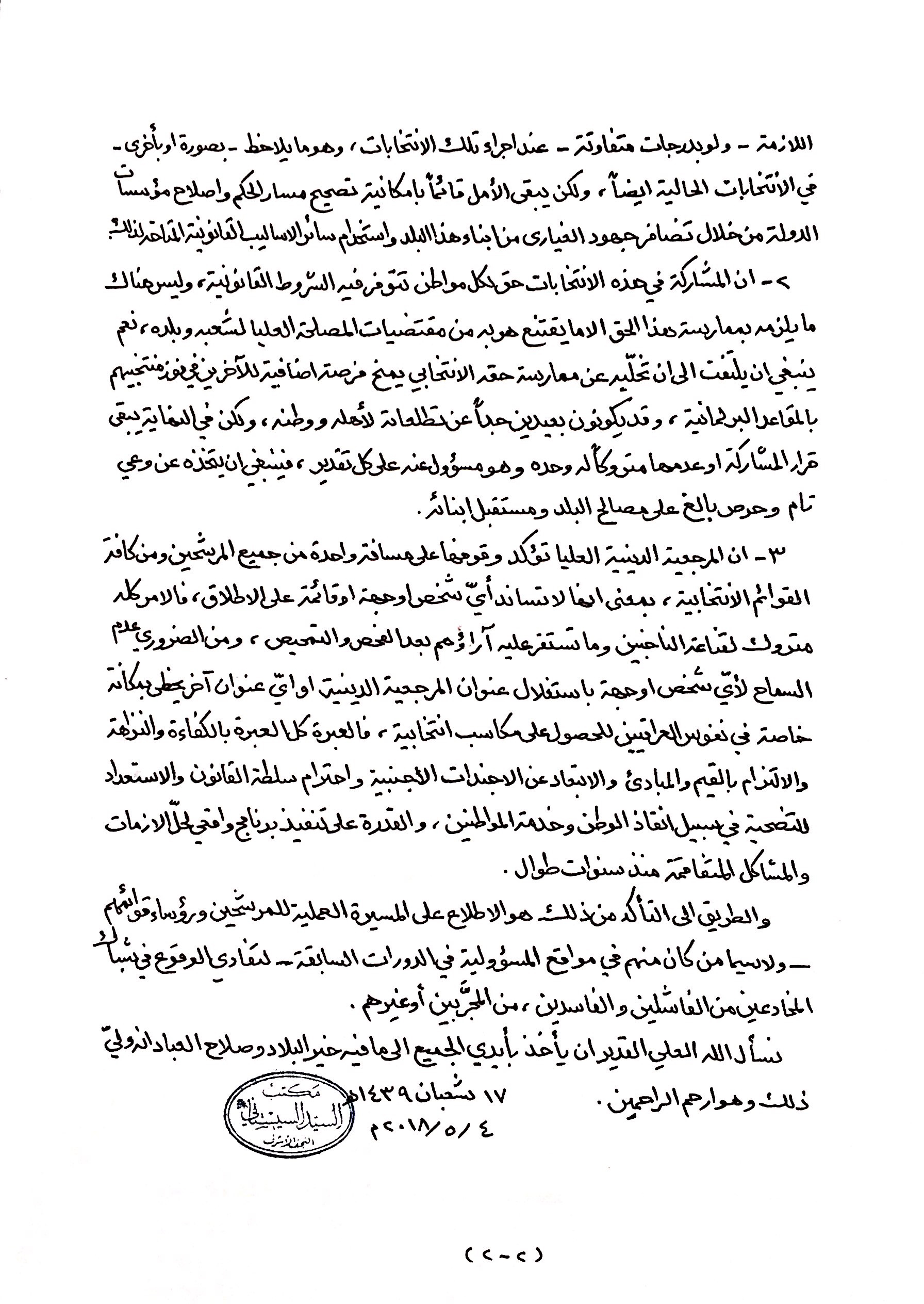 ٣- ان المرجعية الدينية العليا تؤكد وقوفها على مسافة واحدة من جميع المرشحين ومن كافة القوائم الانتخابية، بمعنى أنها لا تساند أيّ شخص أو جهة أو قائمة على الاطلاق، فالأمر كله متروك لقناعة الناخبين وما تستقر عليه آراؤهم بعد الفحص والتمحيص، ومن الضروري عدم السماح لأي شخص او جهة باستغلال عنوان المرجعية الدينية أو أيّ عنوان آخر يحظى بمكانة خاصة في نفوس العراقيين للحصول على مكاسب انتخابية، فالعبرة كل العبرة بالكفاءة والنزاهة، والالتزام بالقيم والمبادئ، والابتعاد عن الاجندات الاجنبية، واحترام سلطة القانون، والاستعداد للتضحية في سبيل انقاذ الوطن وخدمة المواطنين، والقدرة على تنفيذ برنامج واقعي لحلّ الأزمات والمشاكل المتفاقمة منذ سنوات طوال.