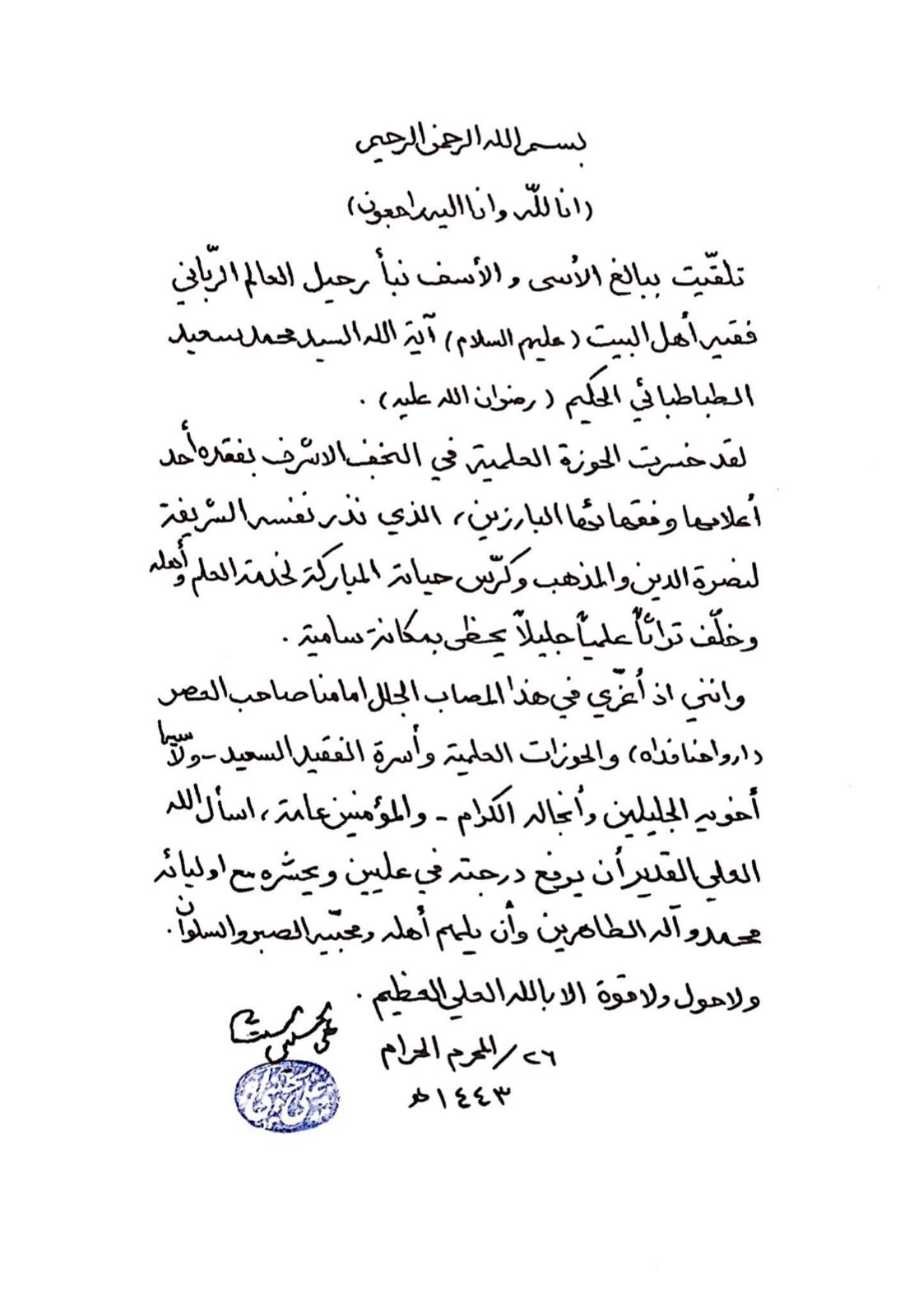 تلقيت ببالغ الأسى والأسف نبأ رحيل العالم الرباني فقيه أهل البيت (عليهم السلام) آية الله السيد محمد سعيد الطباطبائي الحكيم (رضوان الله عليه).